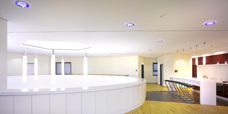 Das Prinzip der Kühldecke ist uns aus dem geschäftlichen Umfeld schon seit längerem bekannt. Wir selbst haben damit schon zu tun gehabt, und konnten bei unserer Entscheidung auf positive Erfahrungswerte zurückgreifen. Wichtig war uns außerdem die uneingeschränkte Möglichkeit der an den Notwendigkeiten der Arbeitsabläufe ausgerichteten Raumgestaltung und Möblierung. Durch den Wegfall sämtlicher Heizkörper sind hier keine Grenzen mehr gesetzt.